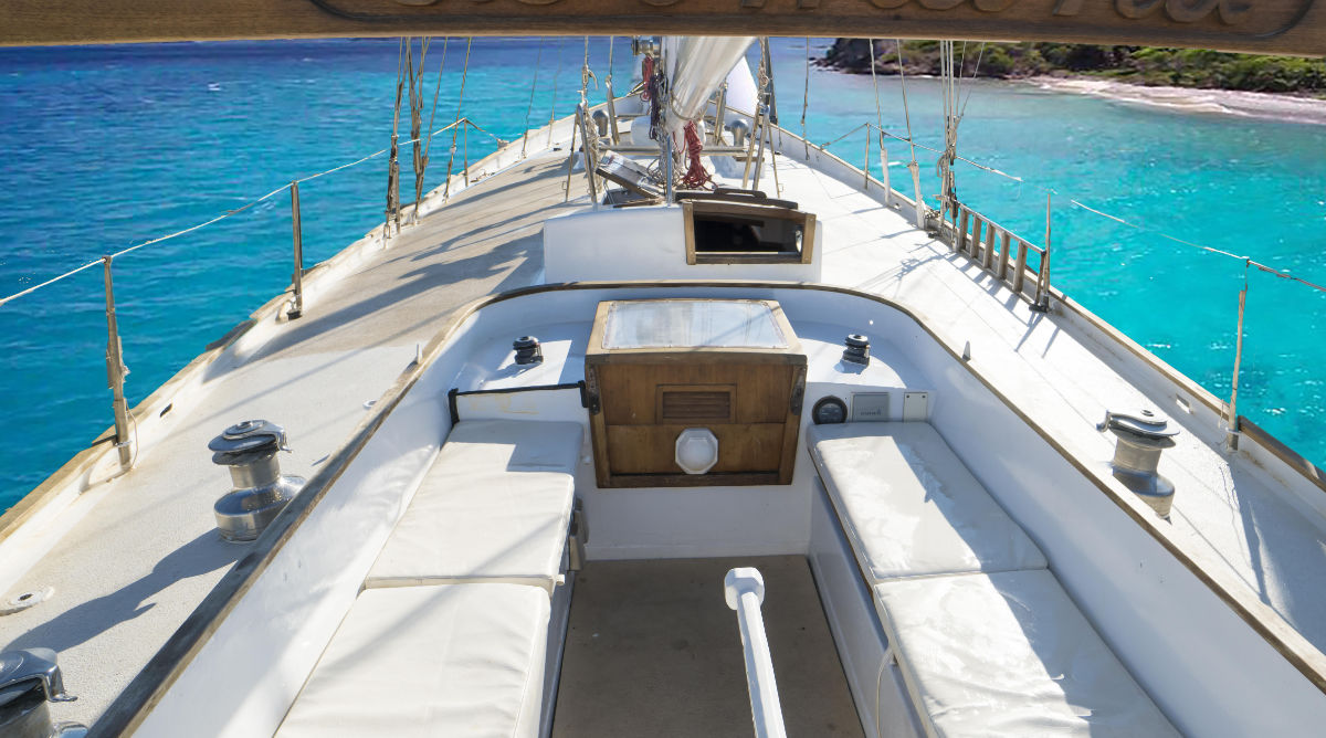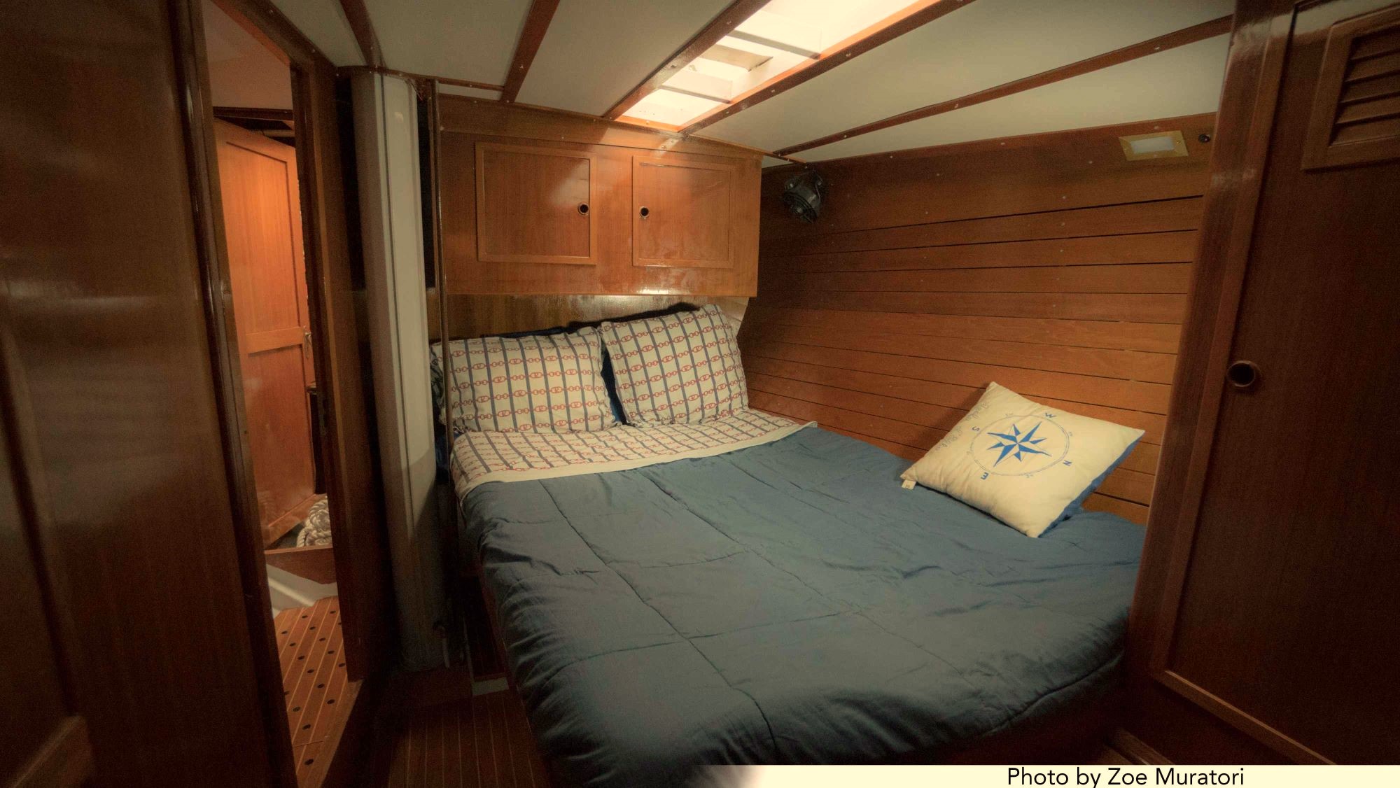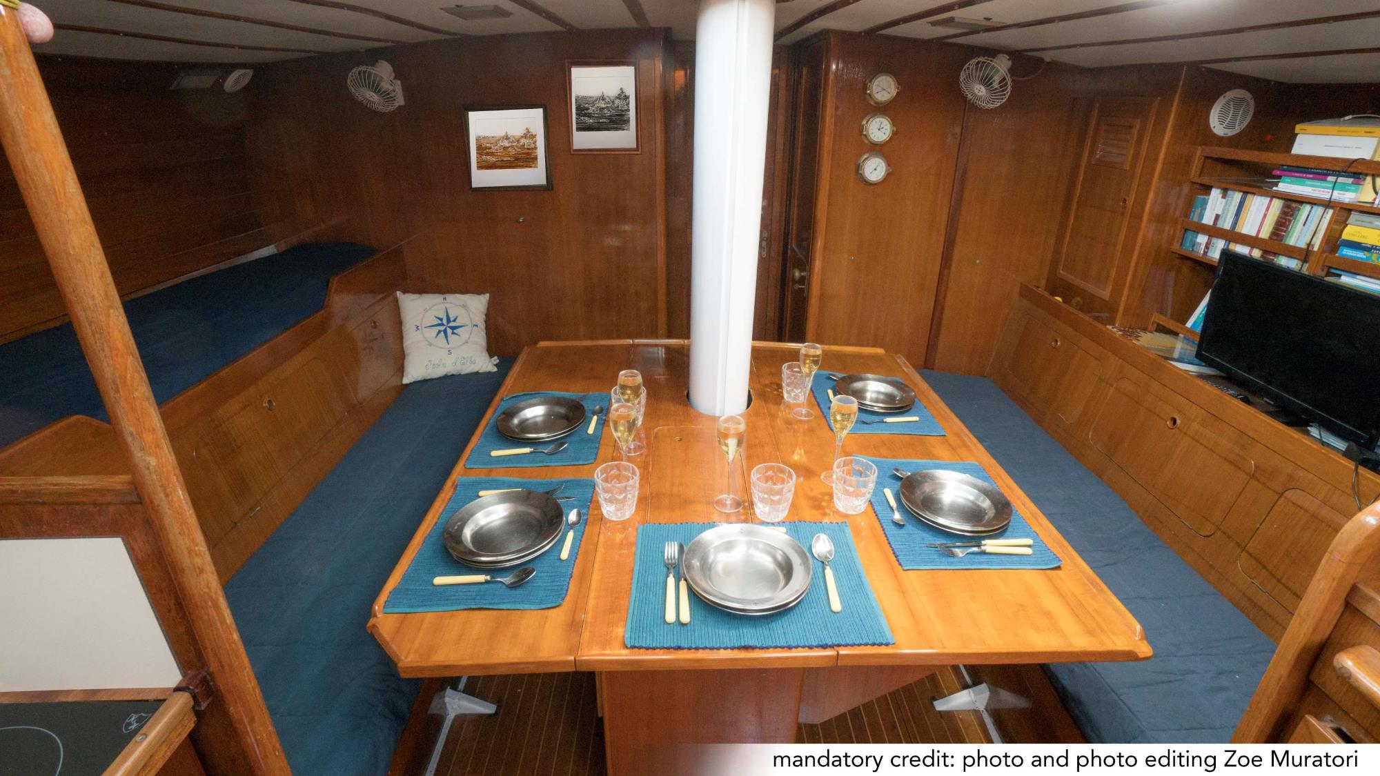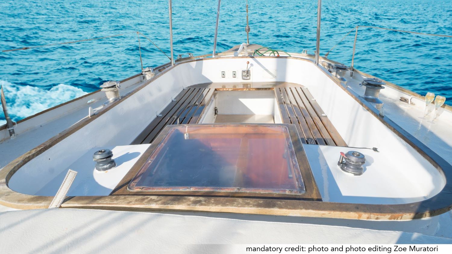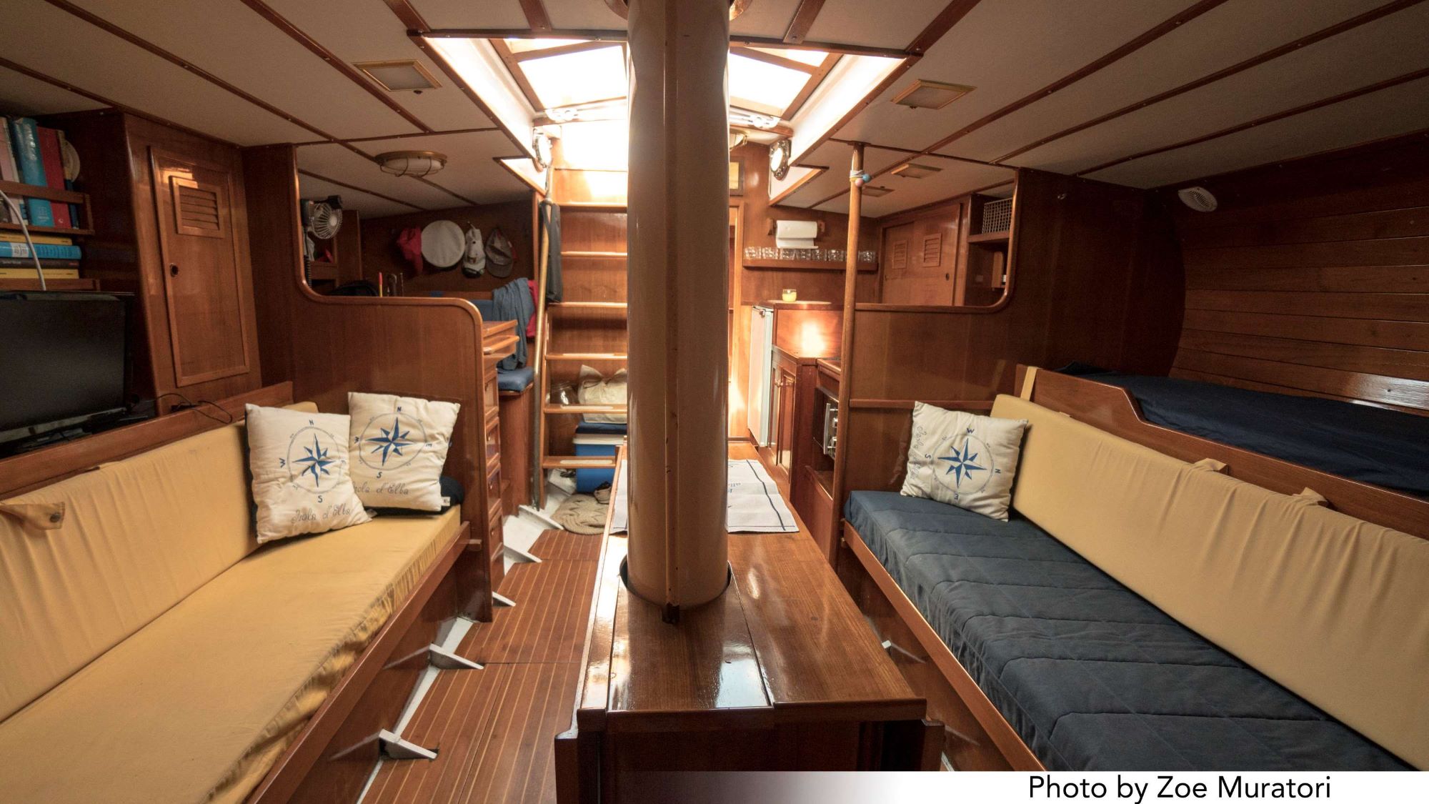 Sottocoperta troviamo una cabina di poppa destinata all’equipaggio, 2 cabine matrimoniali e 1 cabina letti a castello, 2 bagni a disposizione.