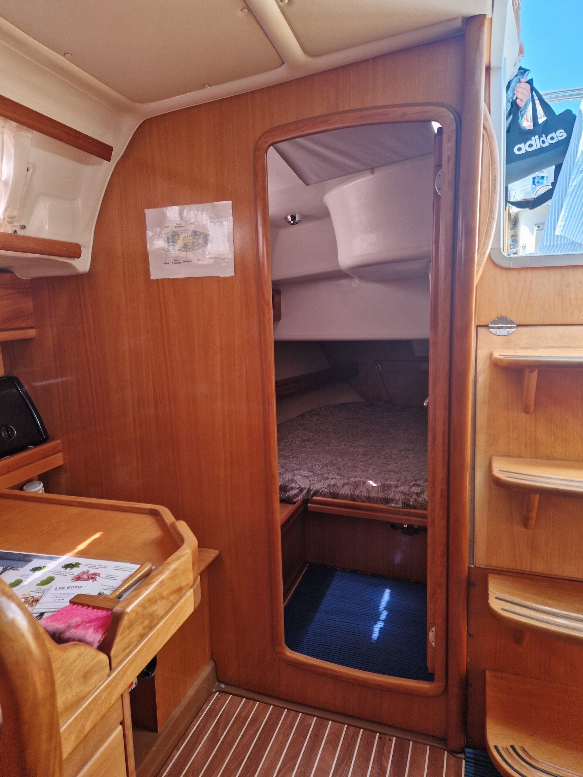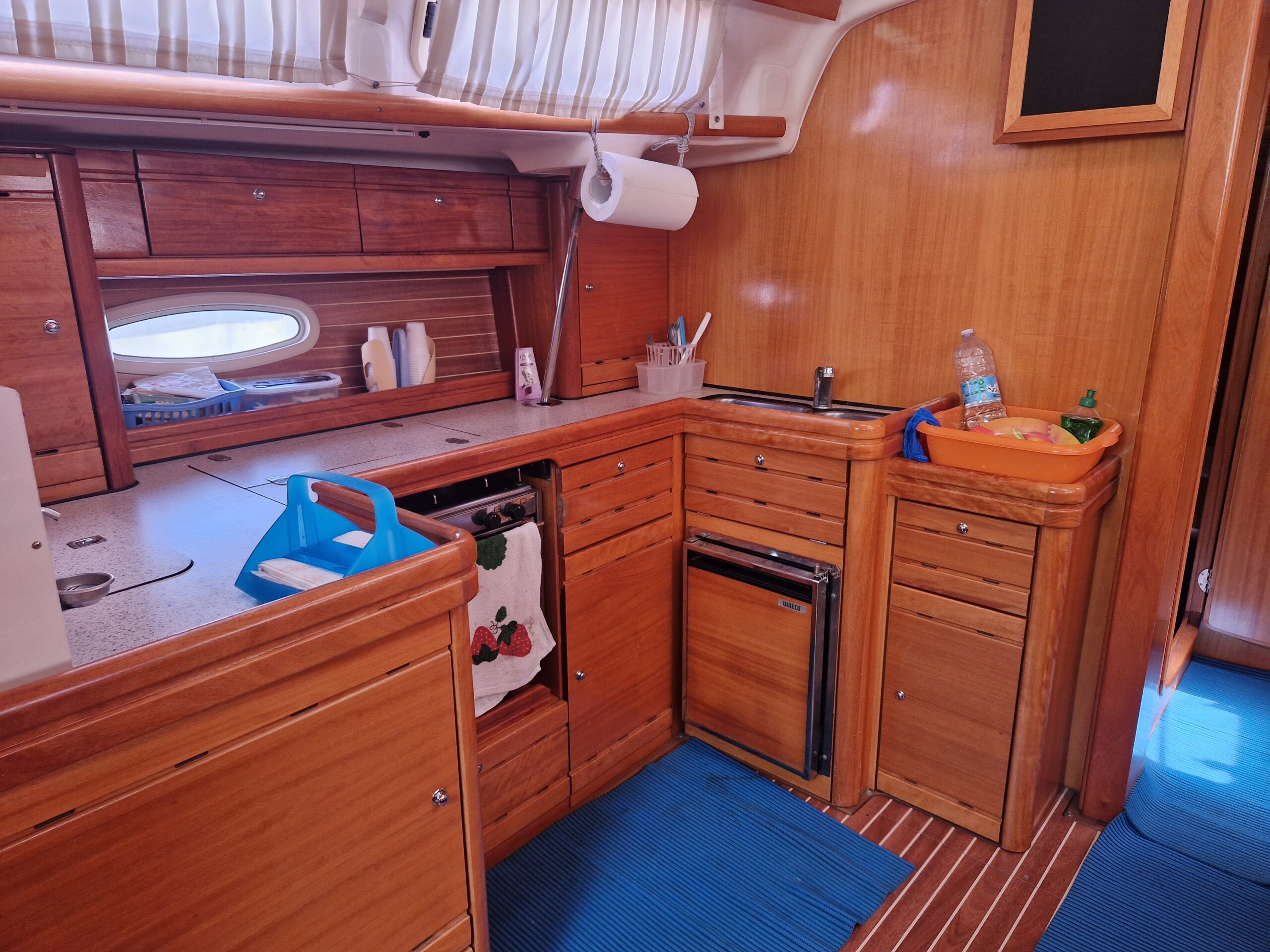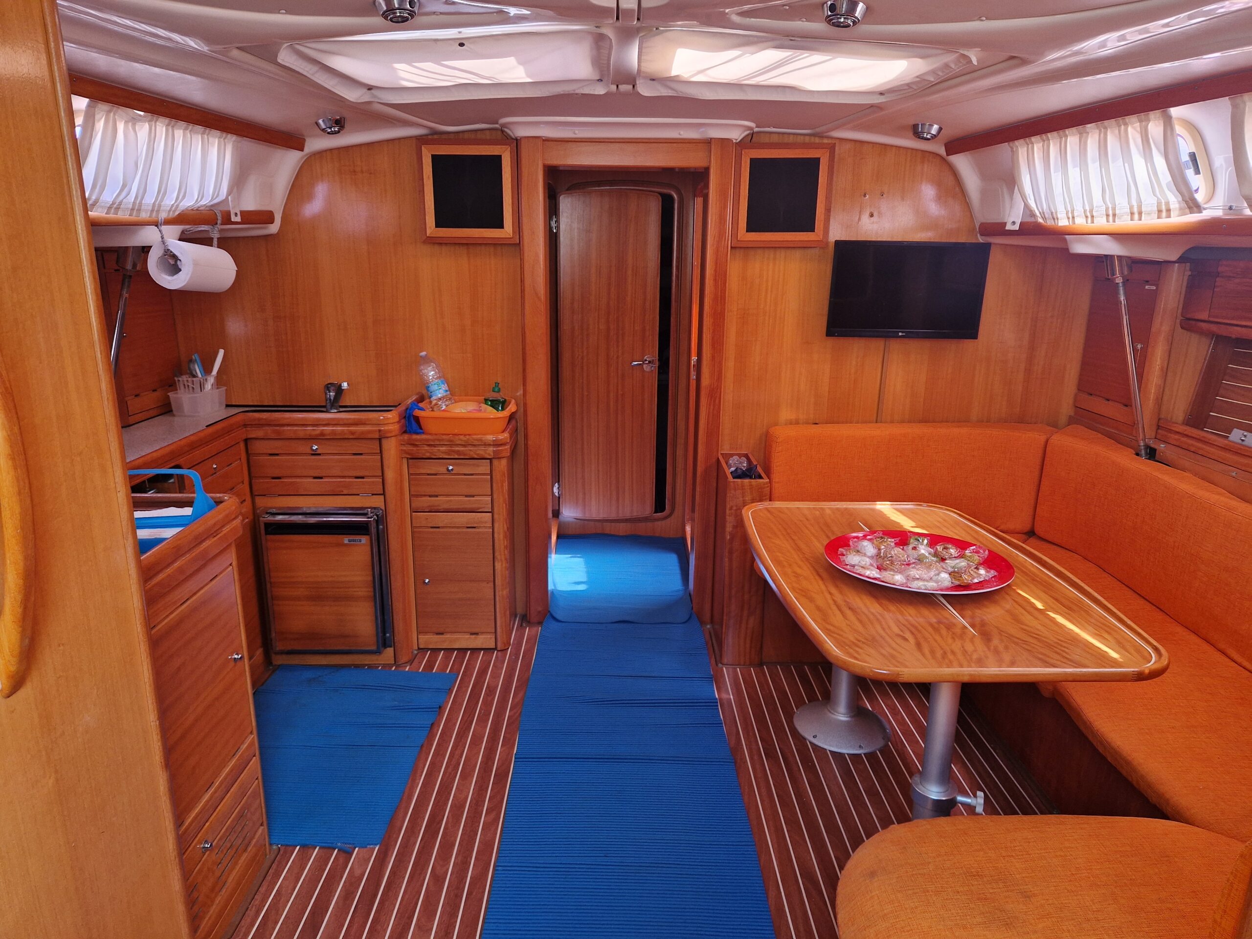 Nel sottocoperta troviamo 3 cabine doppie con il letto matrimoniale e 2 bagni, con anche un divano in dinette per tutto l’equipaggio. Interni molto luminosi e arieggiati grazie ai numerosi oblò. Molto spazio per lo stivaggio della cambusa, la cucina con forno e due fuochi, lavello a doppia buca e due frigoriferi.