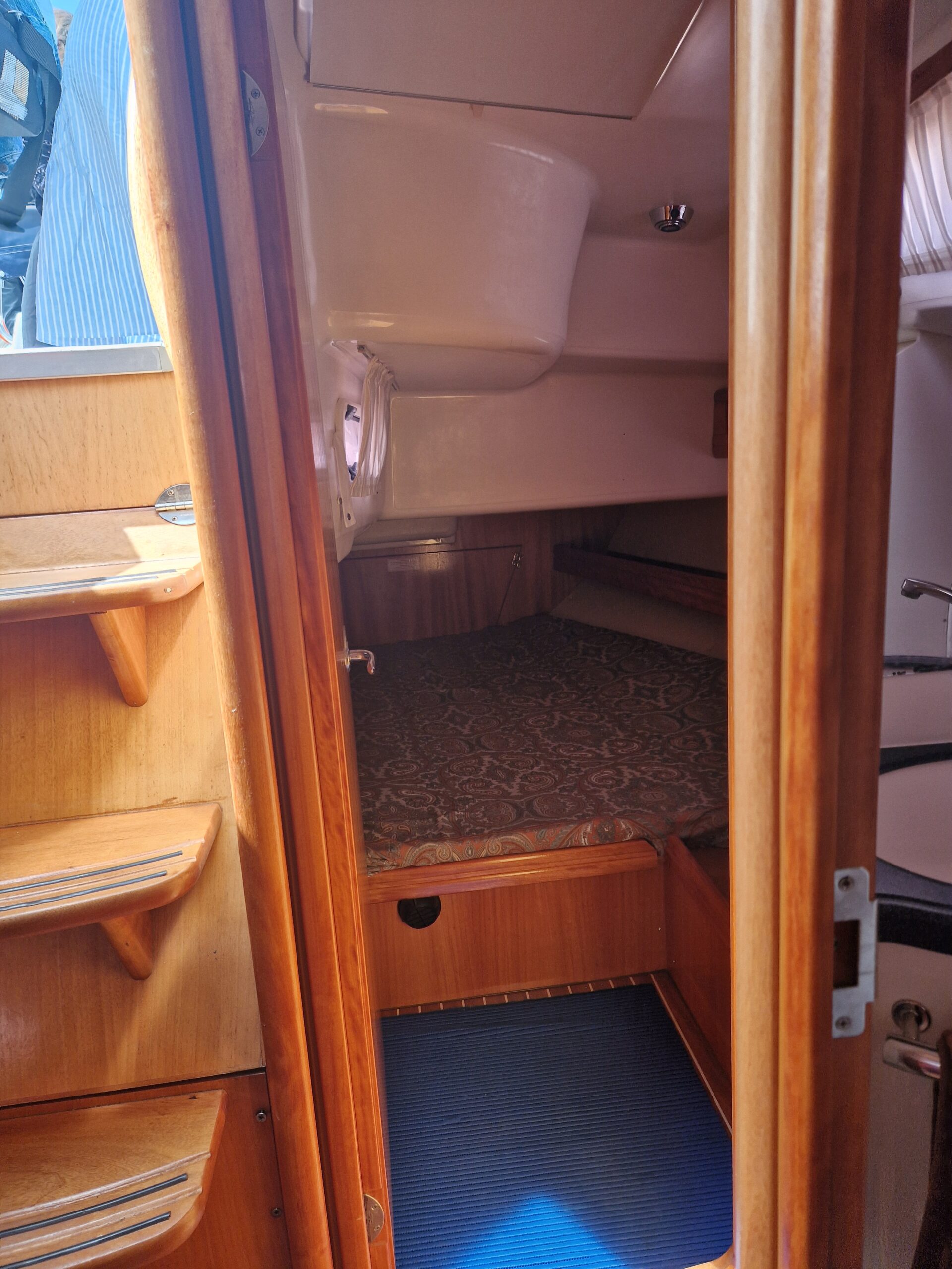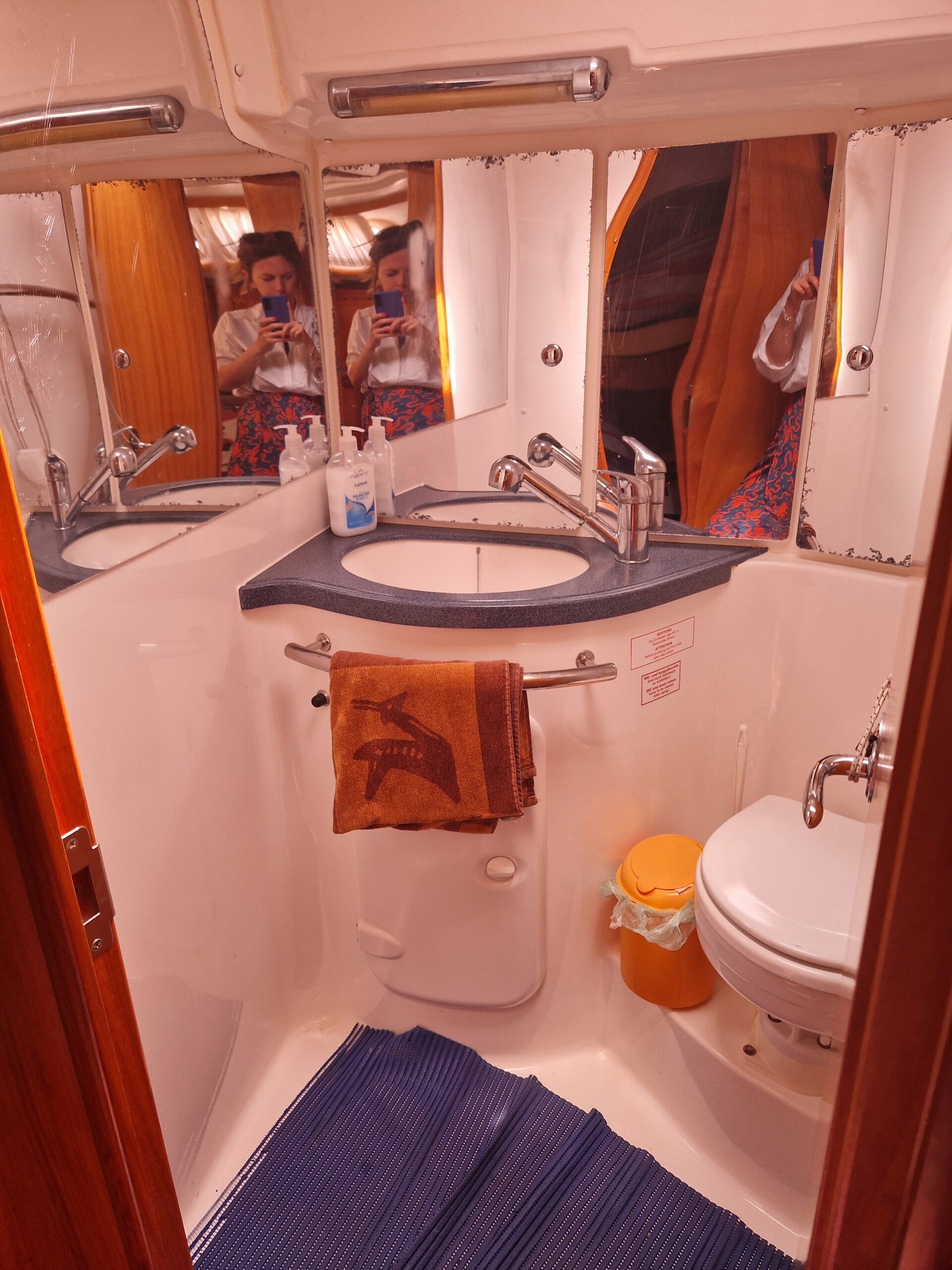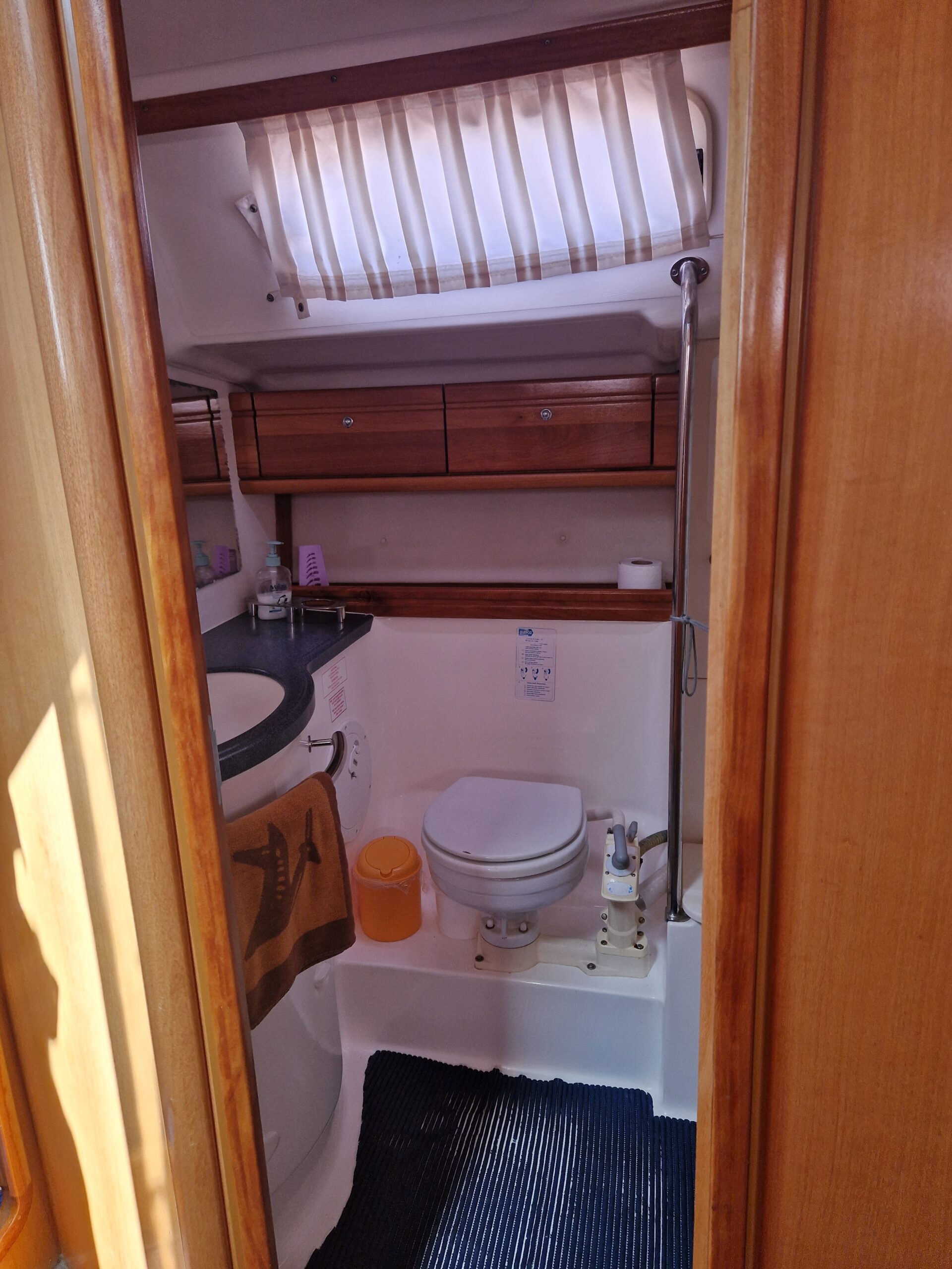 Nel sottocoperta troviamo 3 cabine doppie con il letto matrimoniale e 2 bagni, con anche un divano in dinette per tutto l’equipaggio. Interni molto luminosi e arieggiati grazie ai numerosi oblò. Molto spazio per lo stivaggio della cambusa, la cucina con forno e due fuochi, lavello a doppia buca e due frigoriferi.