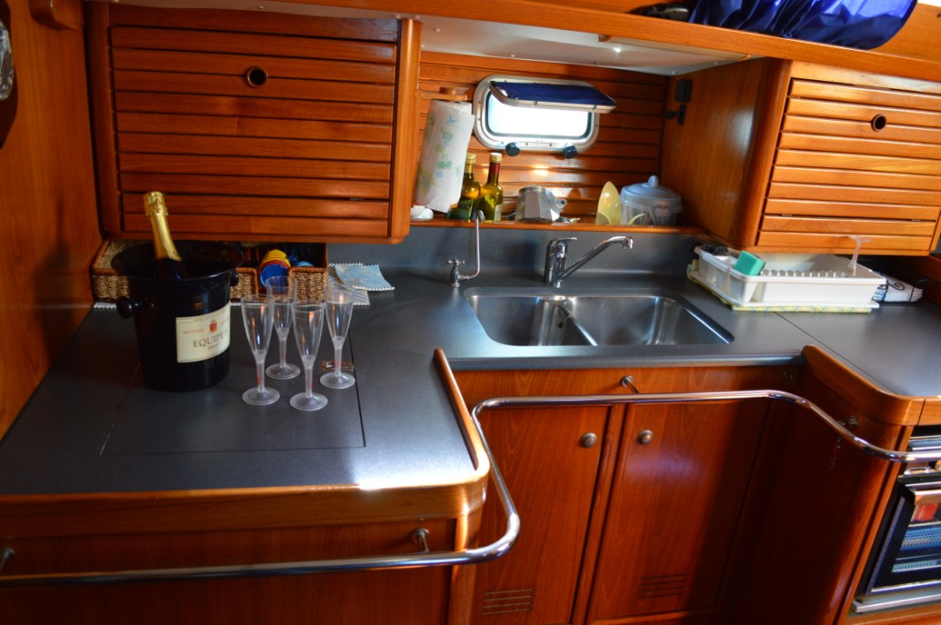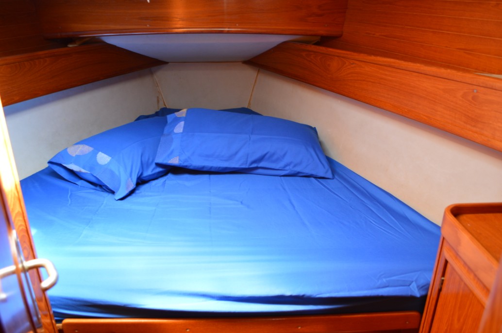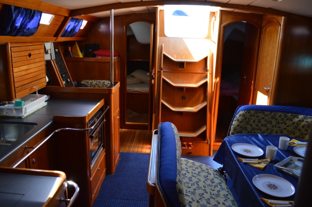 Nel sottocoperta troviamo 4 cabine e 2 bagni (una cabina è riservata all’equipaggio) con anche un divano in dinette. Interni molto luminosi e arieggiati grazie ai numerosi oblò. Molto spazio per lo stivaggio della cambusa, la cucina con forno e 3 fuochi, lavello a doppia buca e frigorifero. Una generosa riserva di acqua di 400 litri e un serbatoio carburante di 200,la rendono ideale per un numero di ospiti di 6-7 persone più 2 di equipaggio