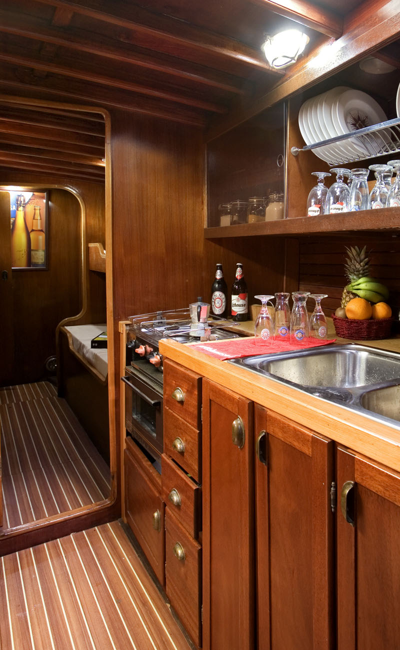 Nel sottocoperta troviamo 3 comode cabine, 2 matrimoniali e 1 con letti a castello di passaggio a disposizione degli ospiti. La dinette è un ambiente particolarmente luminoso e colorato. La cucina è ben attrezzata con forno, doppio fornello, lavello a doppia vasca e frigorifero. Il motore elettrico assicura l’assenza di rumori o odori rendendo la navigazione un momento indimenticabile.