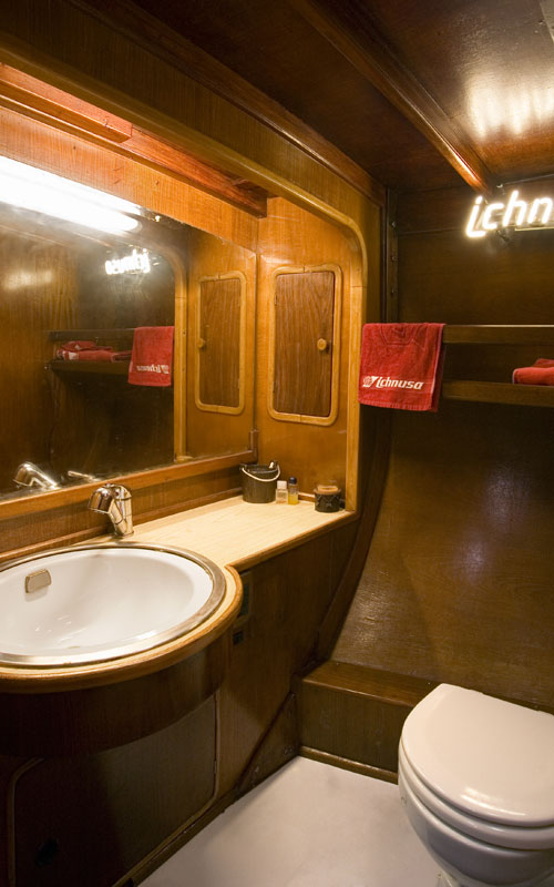A bordo: impianto idrico con vasca di raccolta per le acque nere (soluzione ideale per non inquinare durante le soste nei porti e nelle rade), generatori eolici e pannelli fotovoltaici.