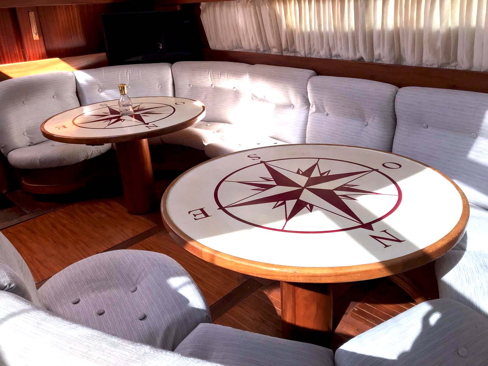 Gli spazi interni sono molto ampli, troviamo 5 cabine doppie di cui 4 matrimoniali e 1 con i letti a castello che accolgono comodamente 10 ospiti e tre bagni elettrici (uno ogni due cabine con accesso diretto). Come spazi comuni troviamo un grande salone con due tavoli, un angolo bar, una cucina che non ha niente da invidiare alle cucine di casa (sono presenti cinque fuochi, un forno a gas e uno elettrico e una serie di elettrodomestici a disposizione). A prua c’è la zona dell’equipaggio con la cabina e bagno.