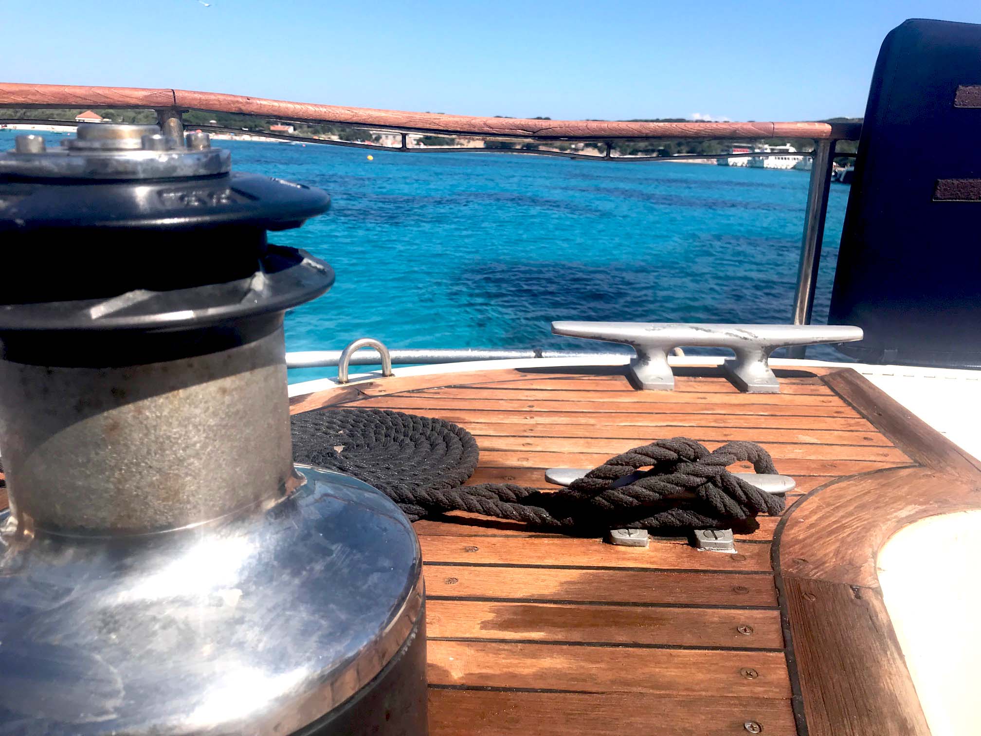 Lo spazio esterno chiamato pozzetto offre il massimo comfort ospitando un tavolo per 15 persone e una zona prendisole dotata di materassi. Compreso un tender di 6 mt in vetroresina con motore permetterà di raggiungere terra (il servizio non è garantito dopo la mezzanotte, in quel caso si potrà usufruire dei taxiboat).