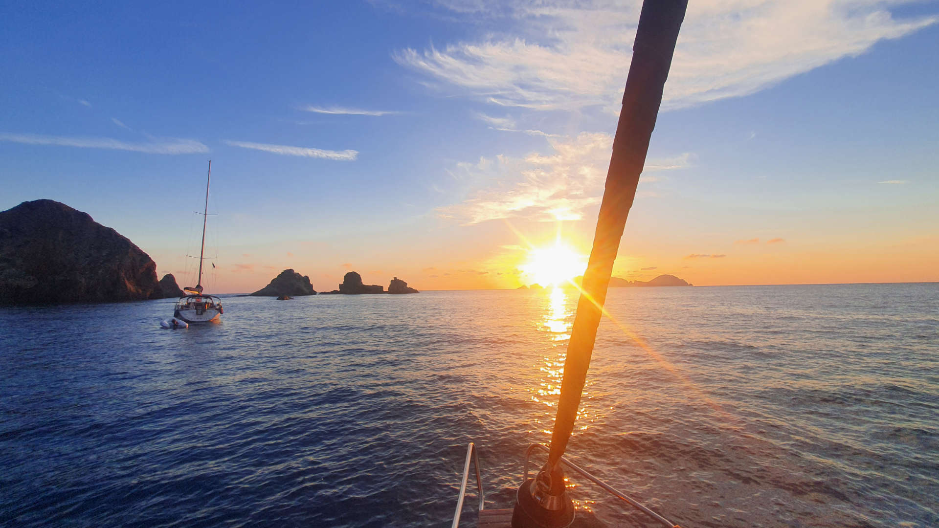 Today we set sail to explore one of the most fascinating islands in the archipelago: Palmarola, a true unspoiled natural paradise. We’ll spend the day sailing around the island, stopping for a refreshing swim in its most picturesque coves, such as Cala del Francese and Punta Tramontana. Here , the towering rock walls sculpted by the wind and sea offer the unique spectacle of the famous “Cathedrals, ” majestic natural sculptures that will leave us breathless. After an exciting passage through the caves of the Faraglioni di Mezzogiorno, in the evening we hoist the sails toward Ponza: a beautiful sunset sail and a magical night at anchor in front of the scenic Chiaia di Luna beach await us .