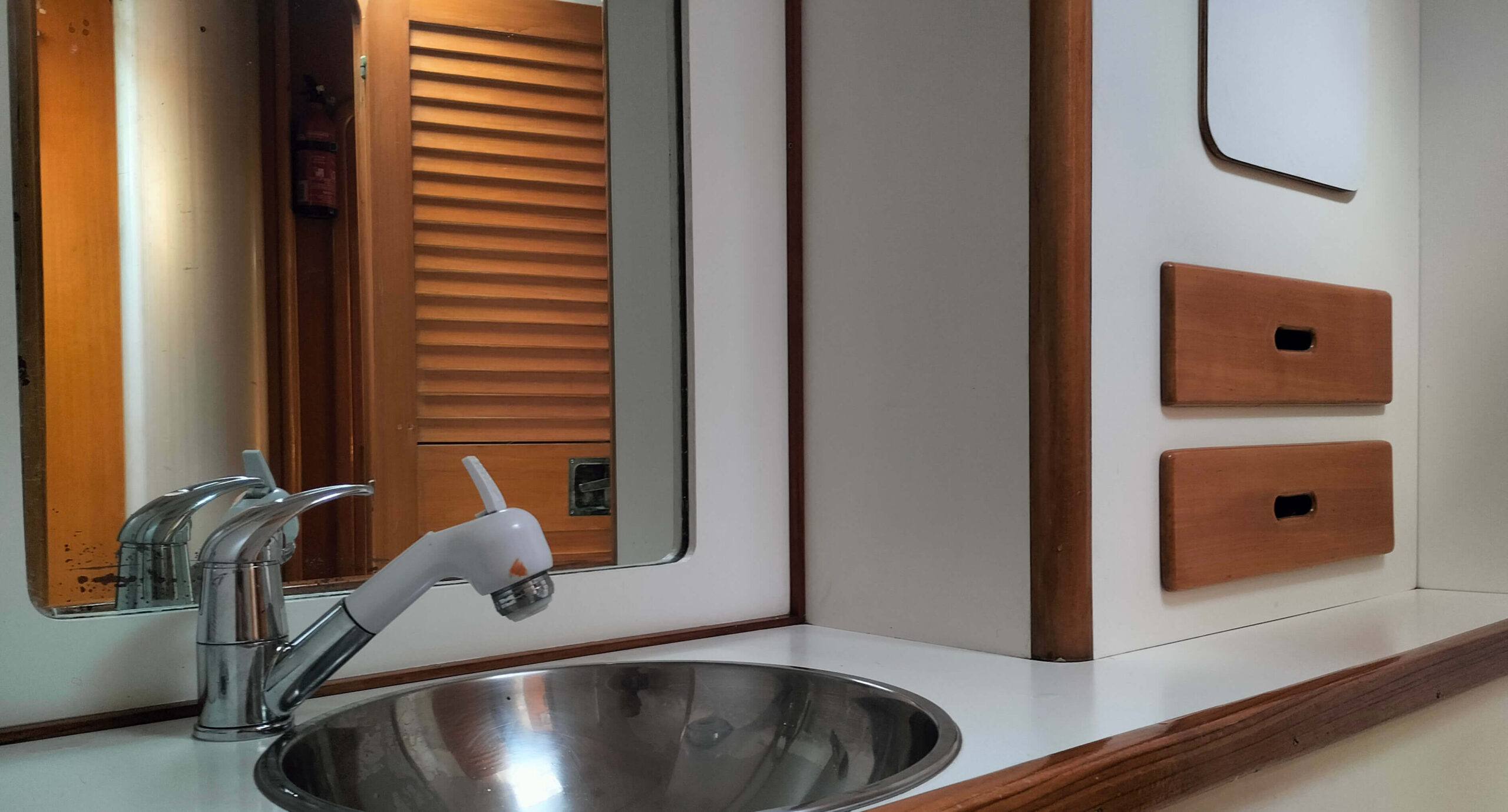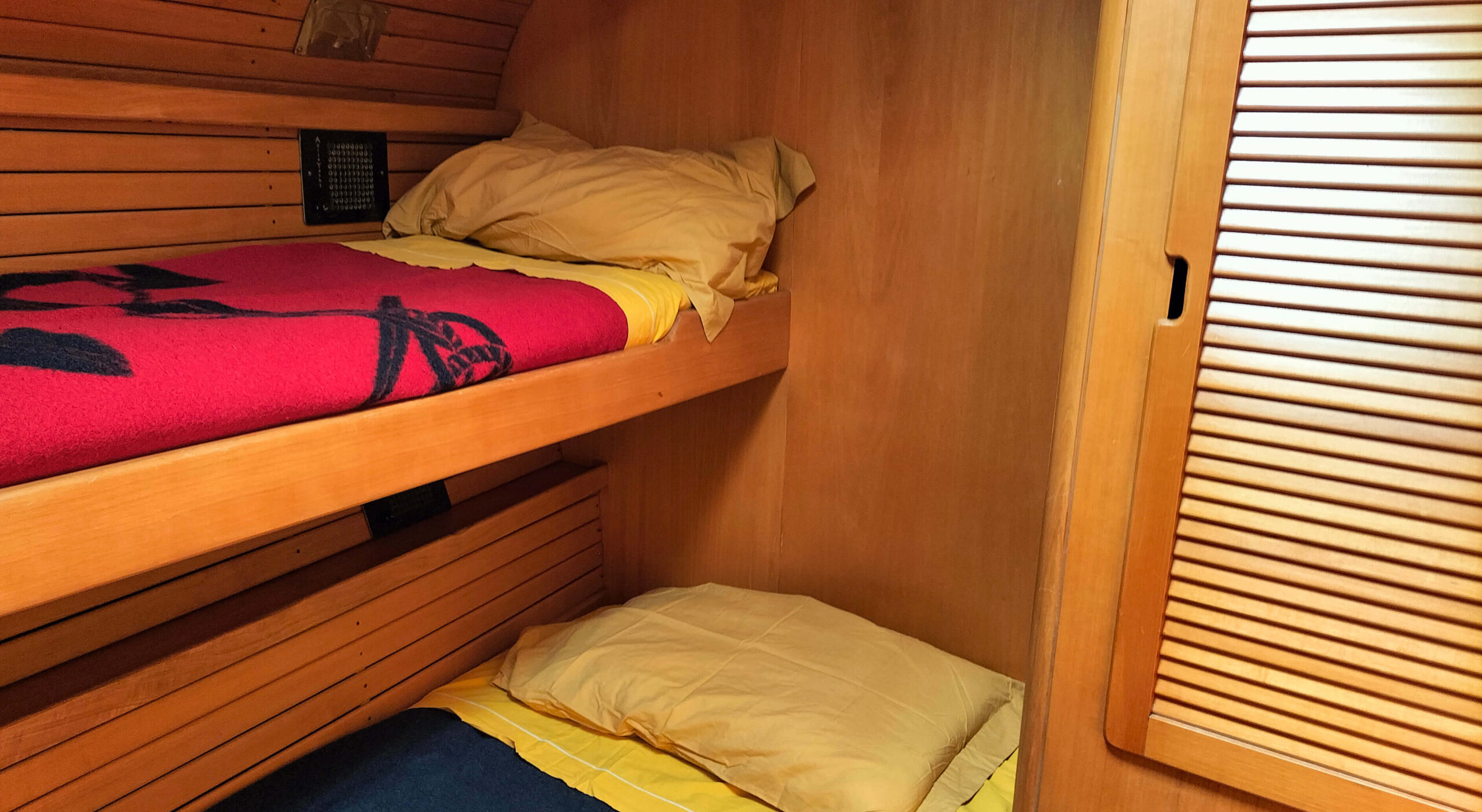 Sottocoperta Gli interni sono ampi e funzionali. La barca dispone di 2 cabine con letti a castello, 2 cabine con letto matrimoniale e possibilità di aggiungere un terzo letto, più una cuccetta di passaggio con due letti separati vicino alla cabina dello skipper. Le cabine a castello sono comode anche per persone alte: una persona di circa 1,85 m riesce a dormire senza problemi. I bagni elettrici a disposizione degli ospiti sono 2.