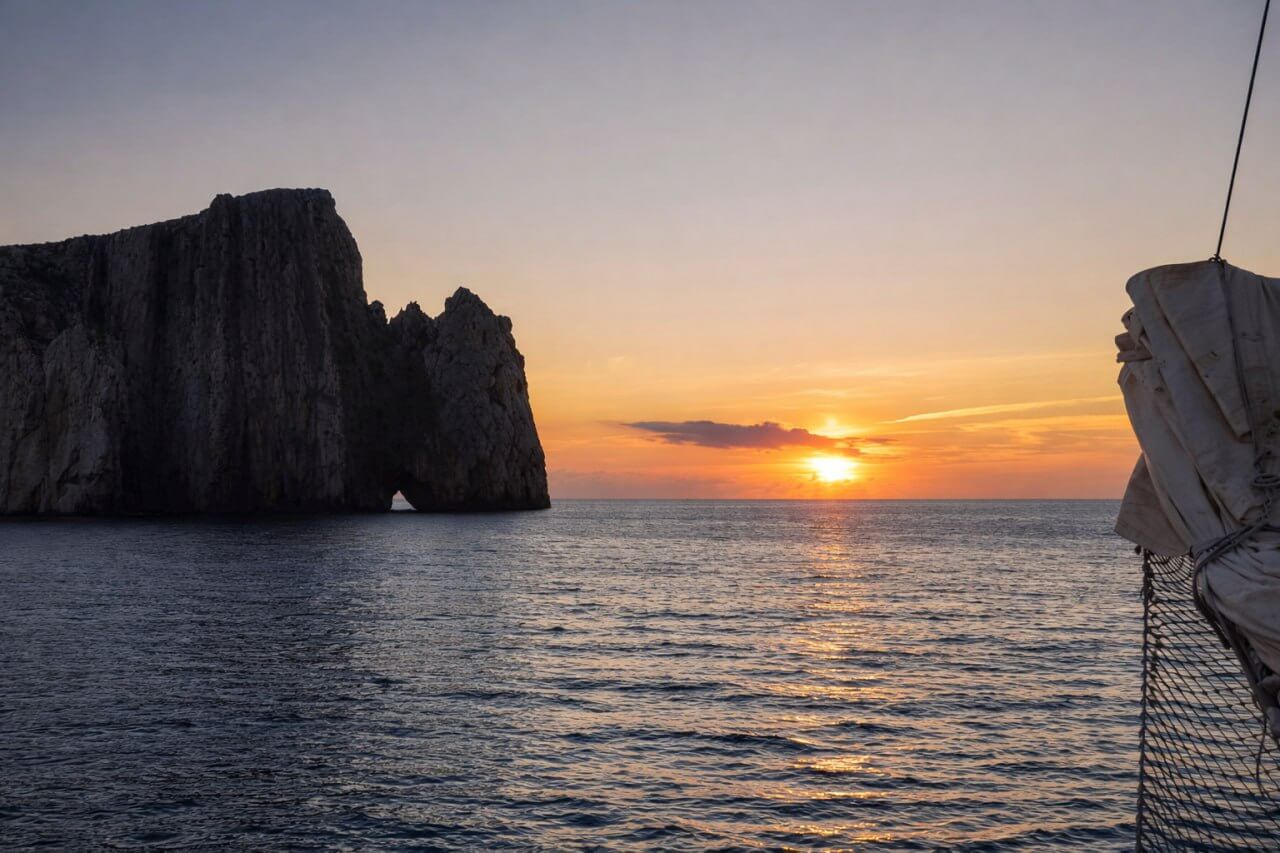 La nostra vacanza in caicco in Sardegna prende il via da Calata Battellieri, nel cuore di Carloforte, sull’Isola di San Pietro. L’imbarco è previsto a partire dalle 14:00, il tempo giusto per prendere confidenza con il caicco e iniziare ad assaporare il ritmo lento del viaggio. Carloforte, inserita tra i Borghi più belli d’Italia, conquista con le sue architetture liberty, i vicoli storici e una forte identità ligure-mediterranea che la rende unica. Nel pomeriggio salpiamo verso Porto Flavia, straordinaria opera di archeologia mineraria scavata nella roccia, affacciata sulle spettacolari scogliere di Pan di Zucchero. Qui ci concediamo la prima nuotata in mare, seguita da una cena tipica a bordo, per iniziare a immergerci completamente nell’atmosfera autentica della vita in caicco.