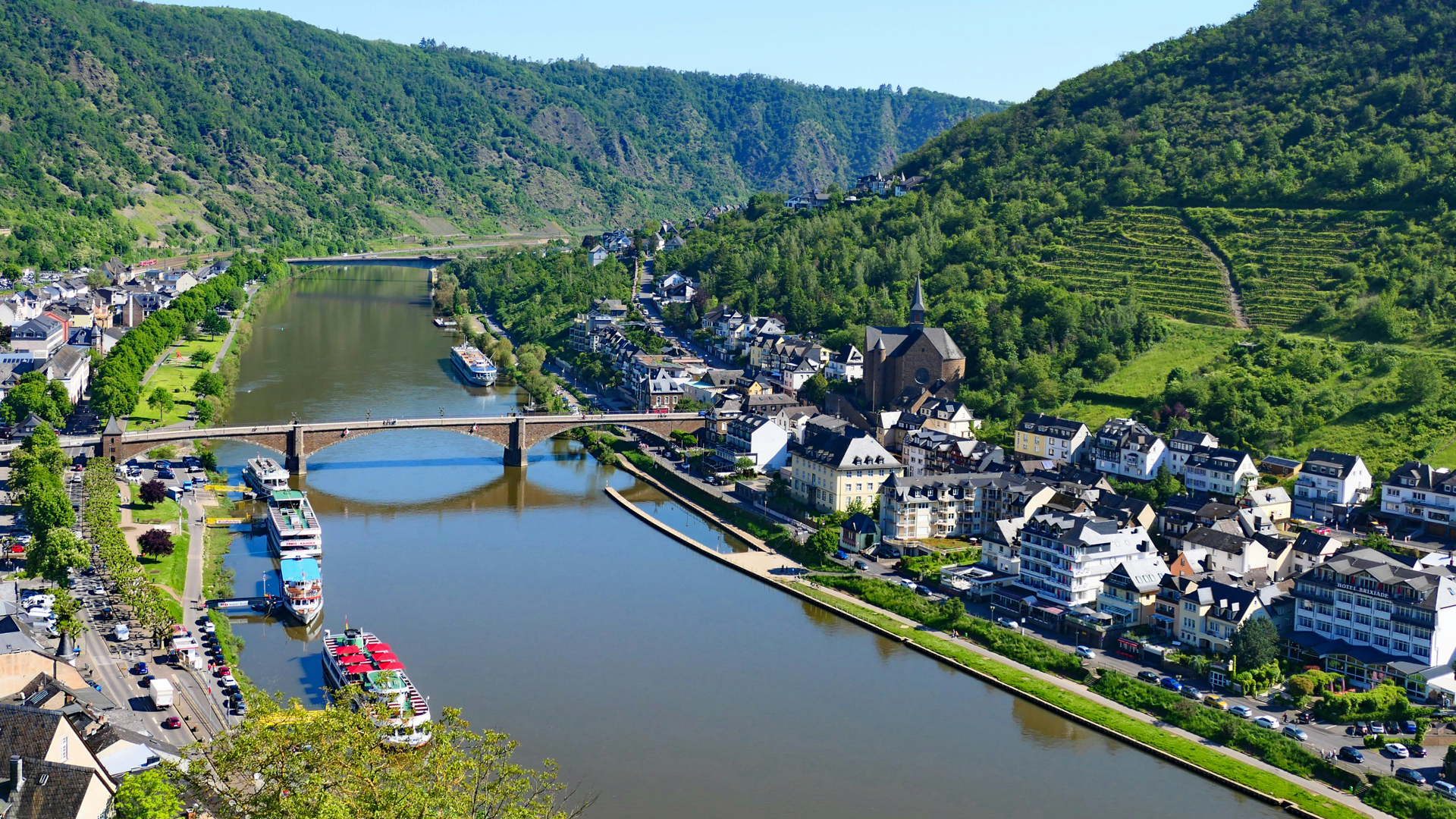Pedalando lungo tranquille ciclabili e stradine di campagna, raggiungerai Bullay, con i resti dei suoi insediamenti romani, e Bremm, celebre per il suo spettacolare vigneto in pendenza e le rovine del monastero di Stuben, incorniciate da un paesaggio che sembra uscito da un quadro. Proseguendo verso sud, il fiume si stringe in un’ansa suggestiva e appare Beilstein, uno dei borghi più belli della valle, chiamato anche la Rothenburg sulla Mosella per il suo fascino d’altri tempi. Case a graticcio, stradine acciottolate e la Rocca di Metternich creano un’atmosfera fiabesca che invita a fermarsi per una passeggiata o un calice di vino locale. Poco più avanti, la strada conduce a Cochem, considerata il vero cuore della Mosella: un gioiello di architettura medievale con un centro storico perfettamente restaurato, ricco di botteghe e locali accoglienti. A dominare il panorama, l’imponente Reichsburg, costruito intorno all’anno 1000 e simbolo della valle. Gli ultimi chilometri verso Treis-Karden scorrono tra vigneti e quiete fluviale.