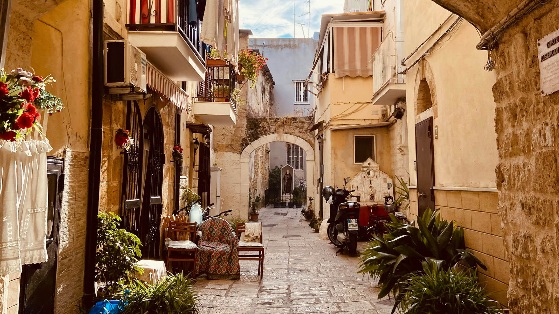 L'appuntamento è nel cuore di Bari, tra i vicoli di Bari Vecchia, quando la città si sveglia e l'aria profuma di pane appena sfornato e bucato steso. Pedalare tra quei vicoli è come entrare nel salotto di una grande famiglia: sedie trascinate, risate, le voci delle donne che trasformano l'impasto in oro culinario, le orecchiette. Questa è la Puglia e il suo abbraccio è caldo e accogiente!