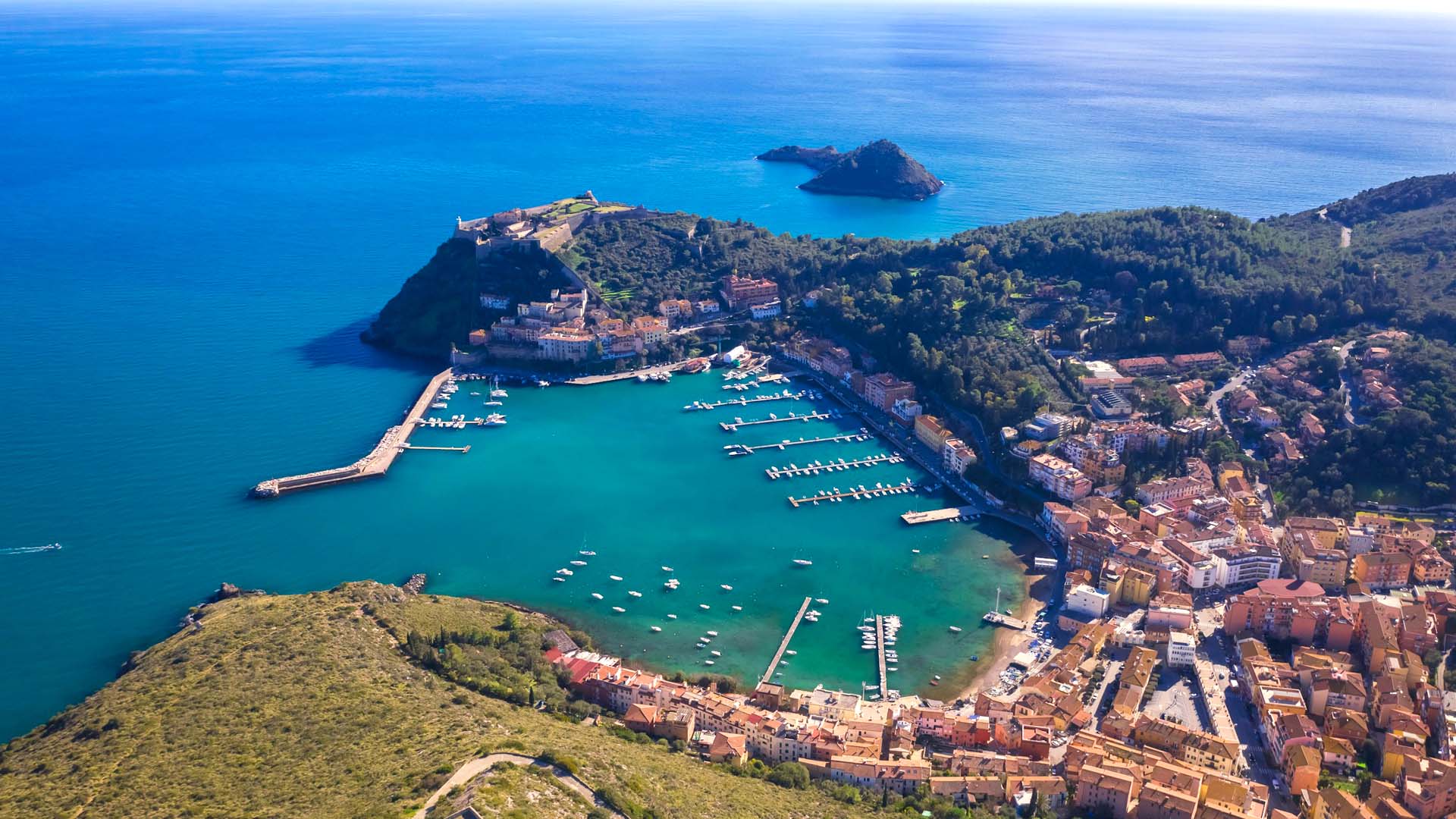 Una volta approdati a Giglio Porto saliamo a piedi o con i mezzi pubblici fino al