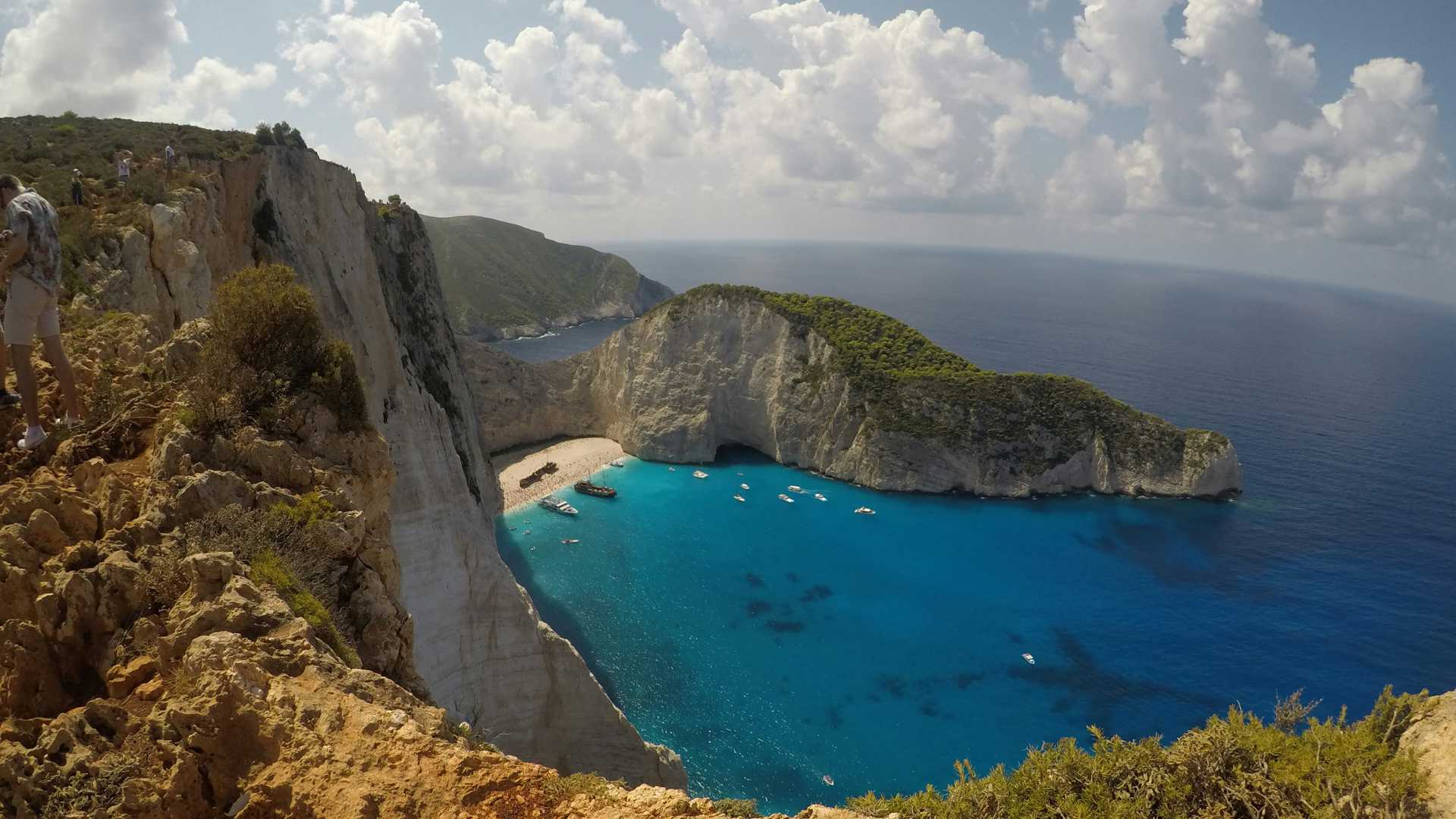 La giornata ci riserva uno dei punti panoramici più famosi dell’isola di Zante: il belvedere sulla Spiaggia del Relitto, conosciuta anche come Navagio Beach. La baia, sulla costa ovest di Zante, è uno dei luoghi simbolo dell’isola e colpisce per il contrasto tra le falesie bianche, il mare ionico dalle tonalità intense e il celebre relitto adagiato sulla sabbia. Il percorso richiede un buon po’ di energia, soprattutto per qualche salita. Lungo la strada attraversiamo una parte più aspra e panoramica di Zante, tra macchia mediterranea, roccia e scorci che si aprono all’improvviso sul Mar Ionio. La spiaggia di Navajo si raggiunge solo in barca, ma dal punto panoramico si apre una vista ampia e spettacolare sull’intera insenatura. Il belvedere è facilmente raggiungibile dalla strada, con un breve avvicinamento a piedi dall’area di accesso.