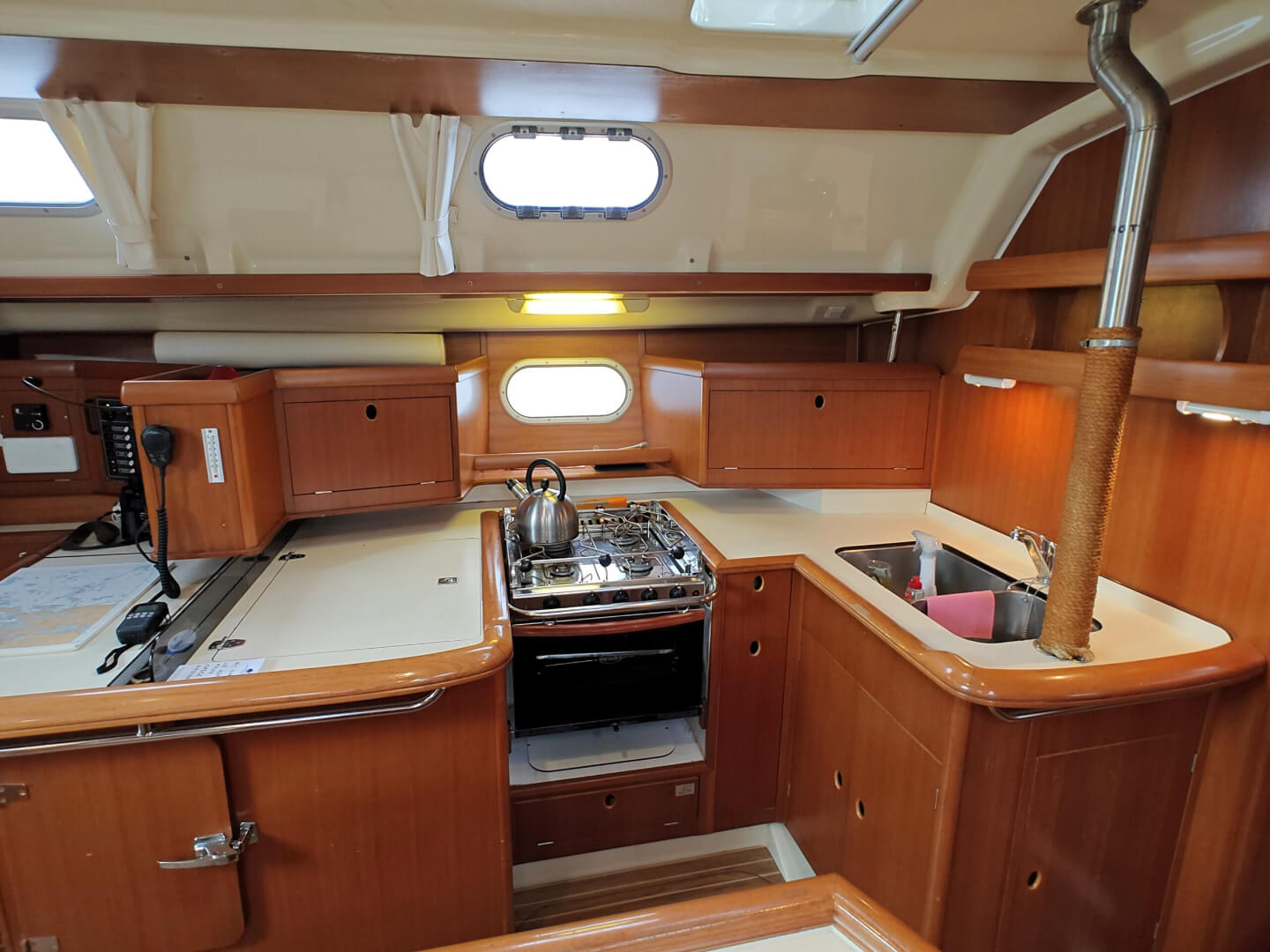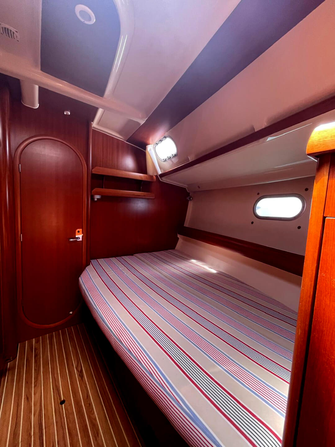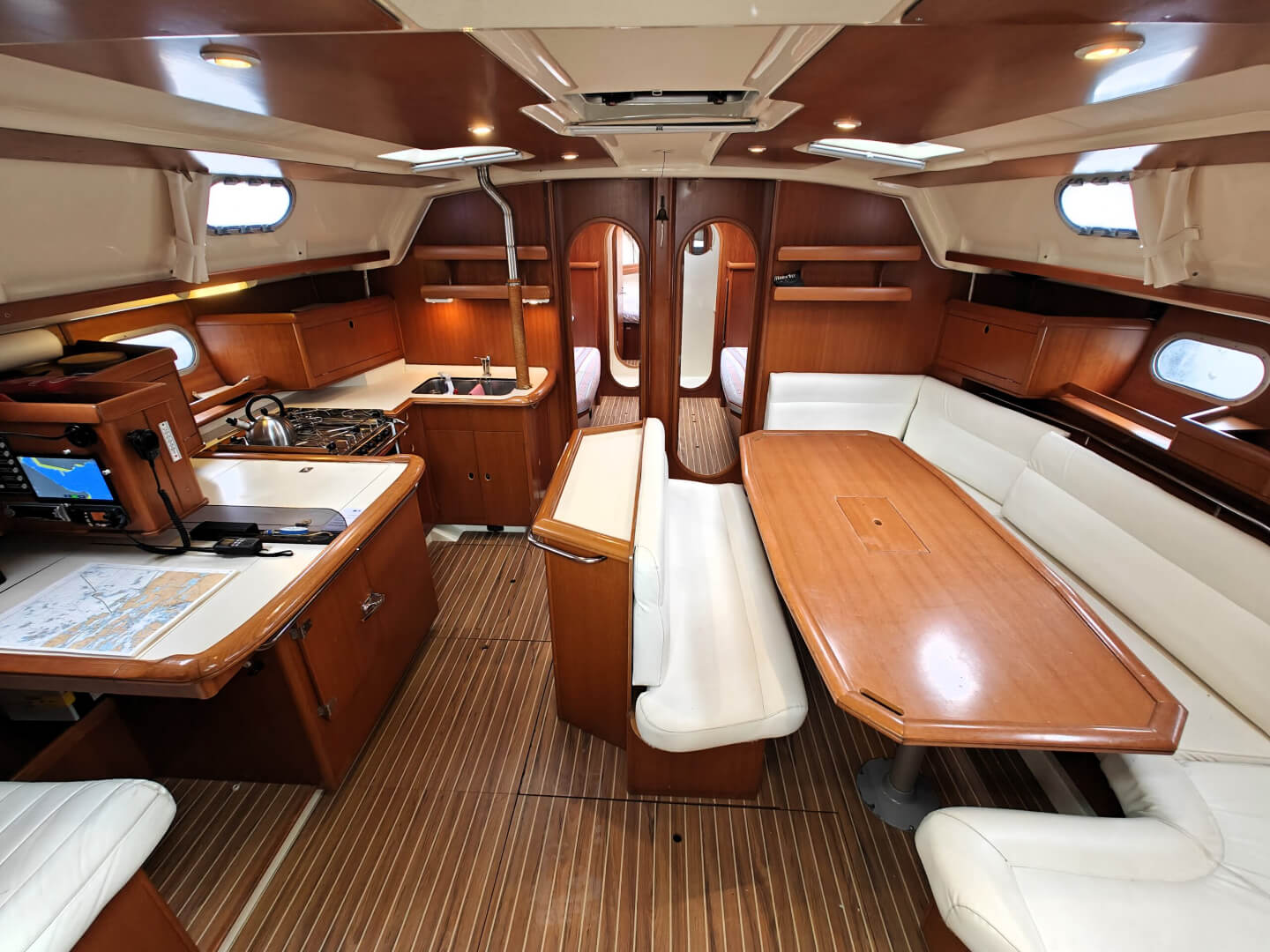 La barca è dotata di 5 cabine doppie ciascuna dotata di oblò e ampi armadi per riporre i propri oggetti. Ogni cabina dispone di un bagno privato con lavandino, wc e doccia. L’equipaggio avrà a disposizione una cabina con l’annesso bagno. Solo in caso di gruppi di 10 persone un bagno sarà in condivisione con l’equipaggio che pernotterà in dinette. Nell’ampia zona dinette si trova la cucina ben attrezzata con 4 fuochi, forno, grande frigorifero e frezeer e un tavolo da 10 e più persone il luogo ideale per preparare memorabili cene. Il legno è il fattore dominante degli interni che rende l’ambiente accogliete.