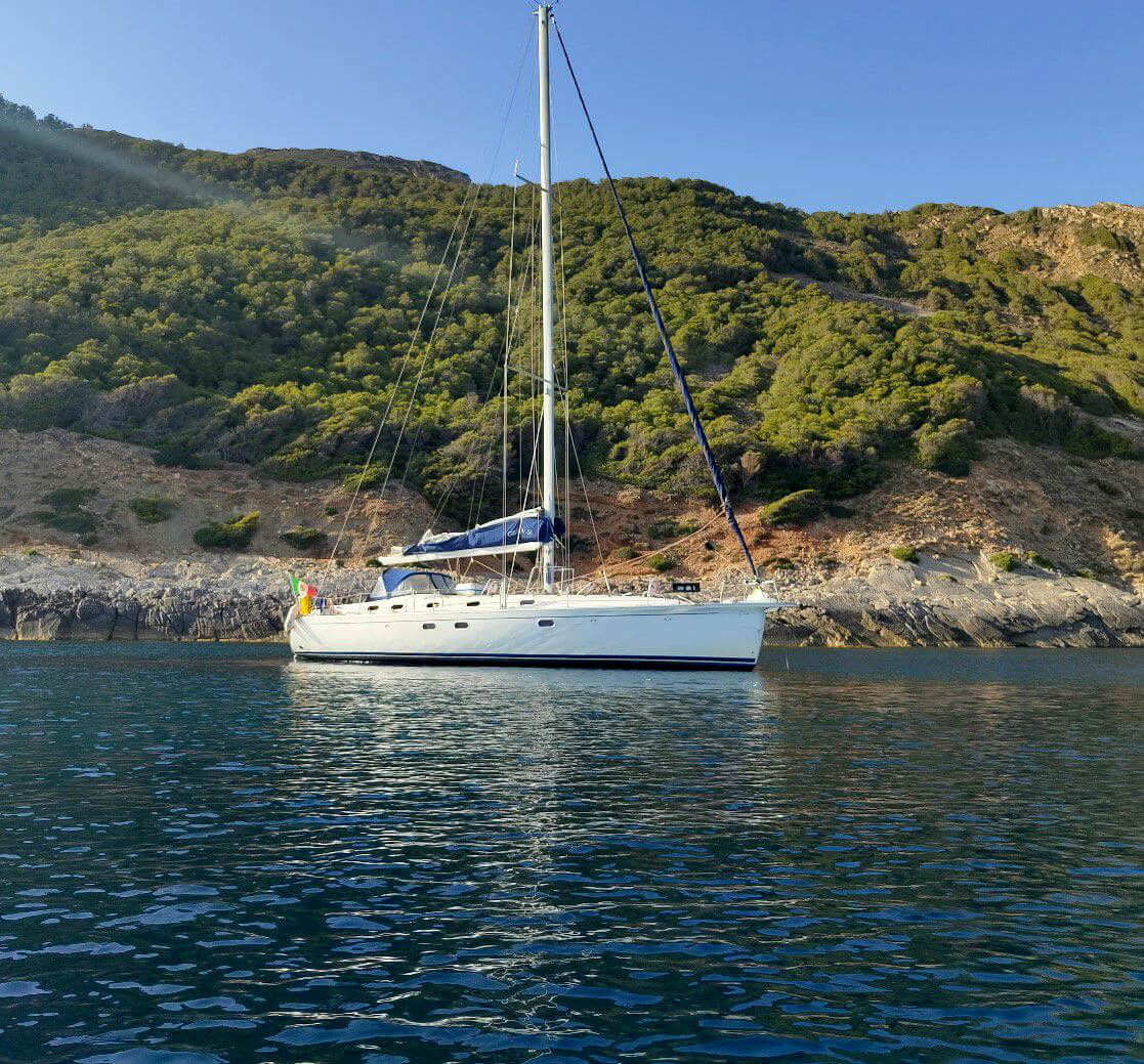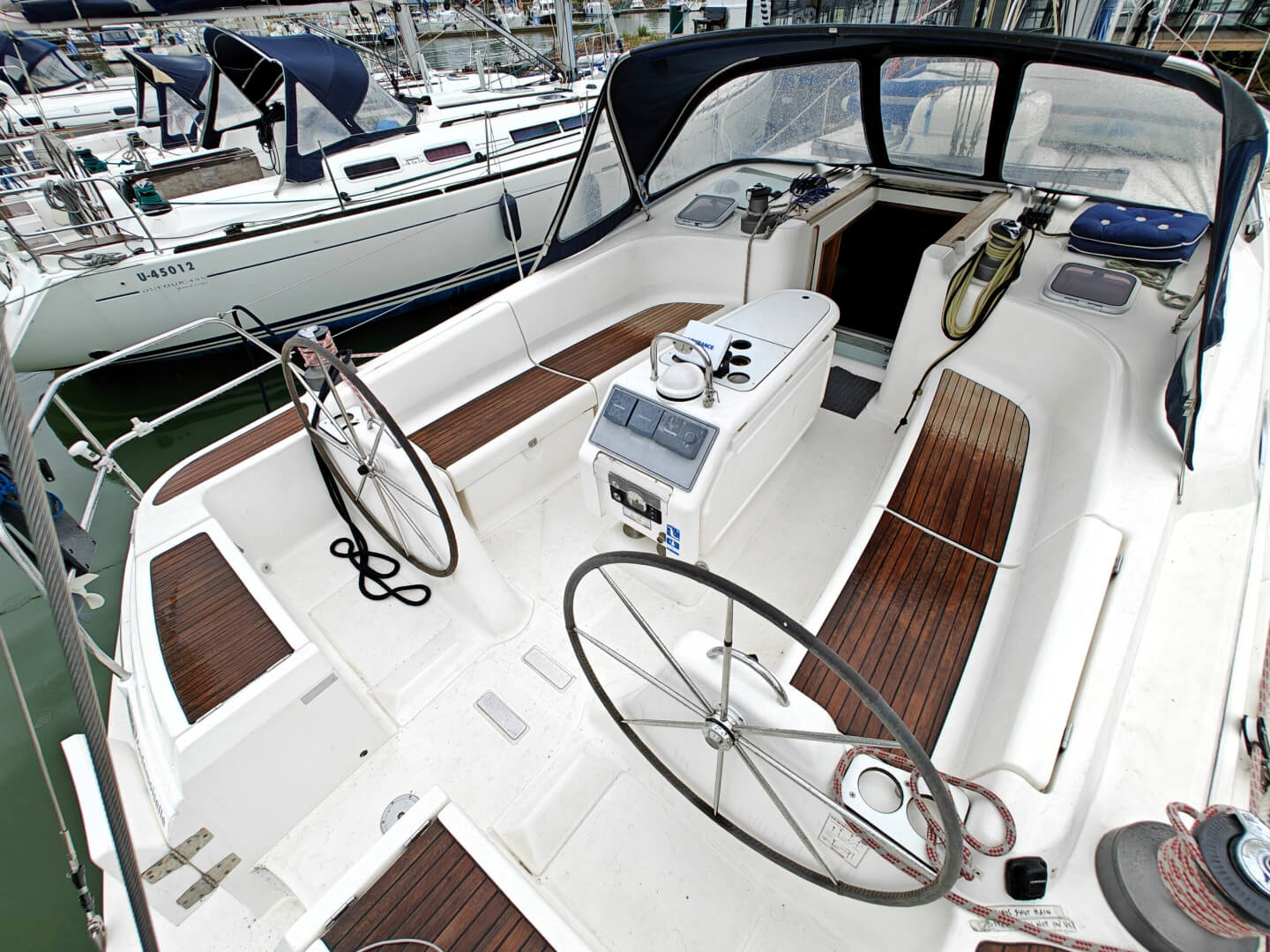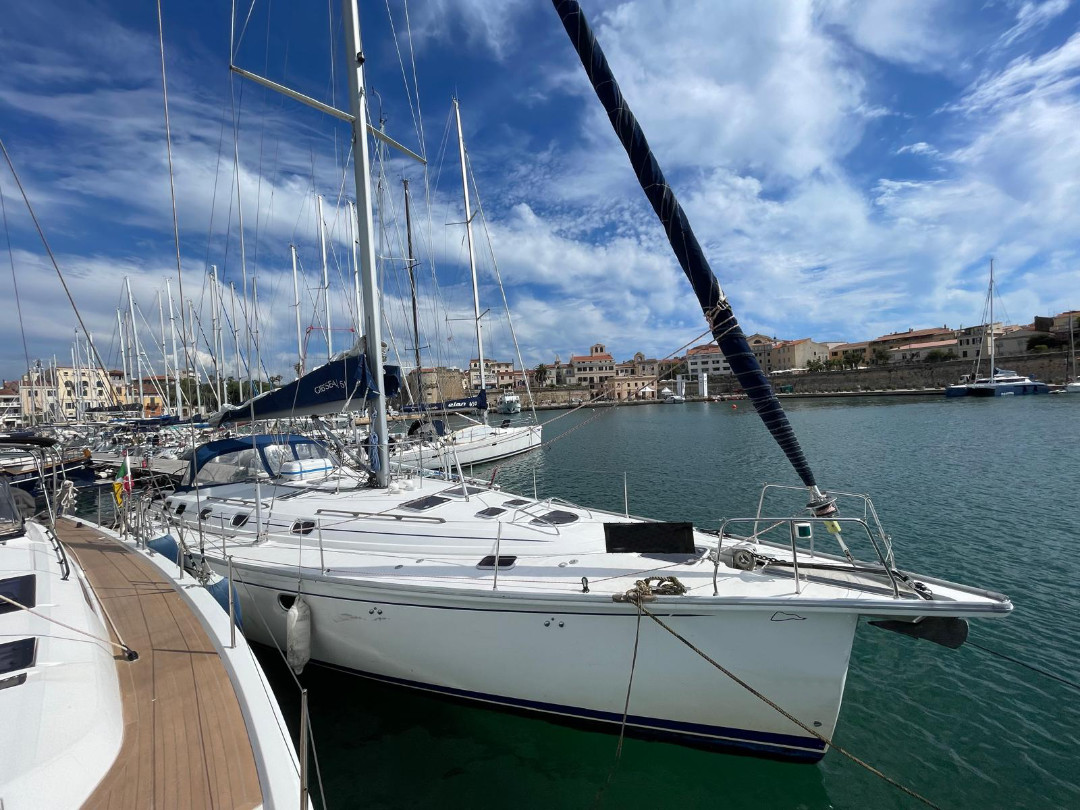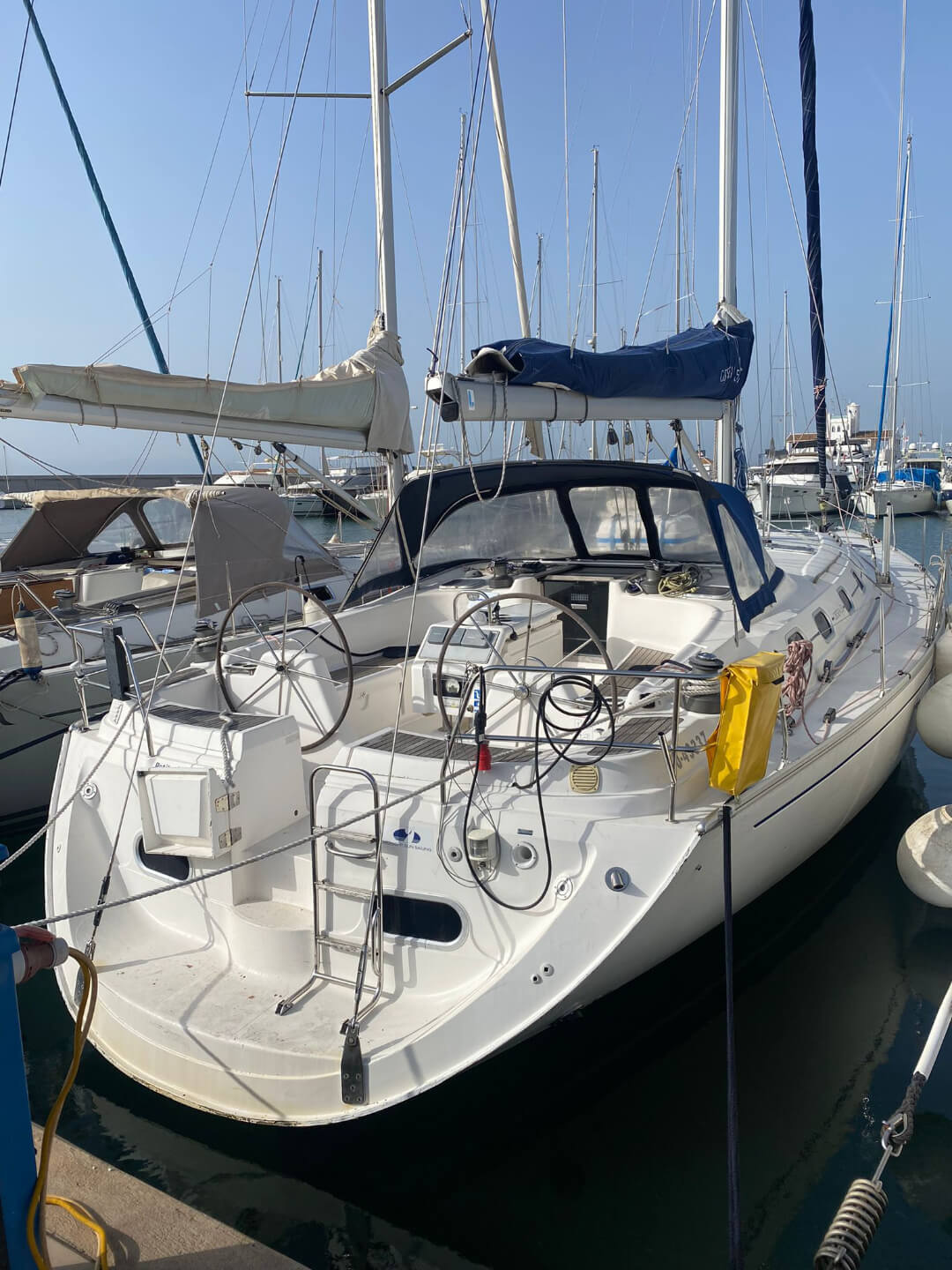 Sopracoperta troviamo una confortevole zona prendisole a prua dotata di cuscineria su cui rilassarsi durante la navigazione e un ampio pozzetto con tavolo adattabile per 10 e più persone. La poppa è attrezzata per la discesa a mare con scaletta e doccia esterna.