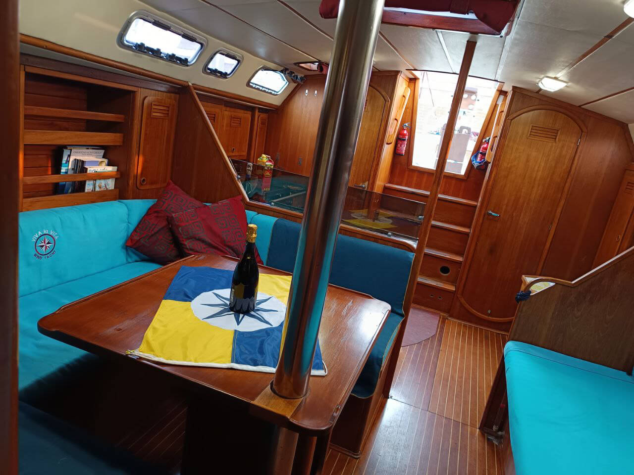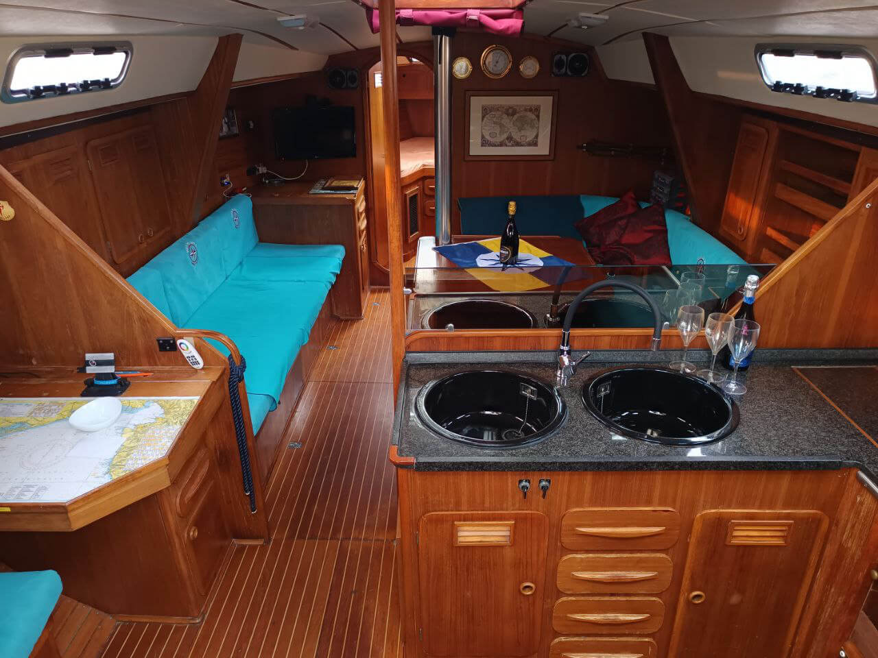 Gli interni sono accoglienti e funzionali, con 3 cabine doppie, 1 bagno e una dinette centrale pensata come zona conviviale. La cucina è attrezzata per la vita a bordo e gli spazi sono studiati per offrire comfort anche durante una vacanza di più giorni.