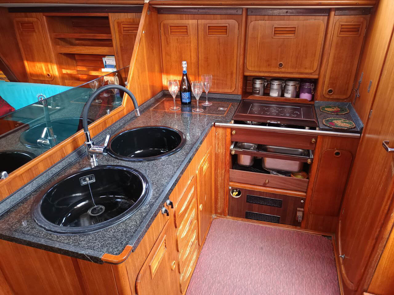 Dispone di 3 cabine doppie e 1 bagno, una configurazione ideale per piccoli gruppi che vogliono condividere l’esperienza senza rinunciare alla giusta privacy. È una barca affidabile, stabile e adatta anche a chi è alla prima esperienza in barca a vela.